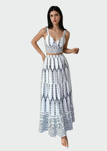 Impresivan bijeli dvodijelni set s crnim geometrijskim vezom koji odiše mediteranskom elegancijom. Cropped top sa širokim naramenicama i dubokim dekolteom savršeno se uklapa s dugom suknjom opuštenog kroja, stvarajući prozračnu i ženstvenu siluetu. Idealan za ljetne šetnje, elegantne izlaske i odmor sa stilom.