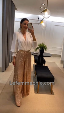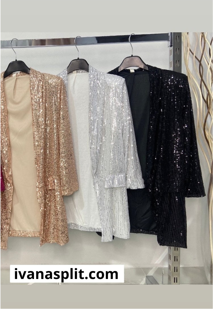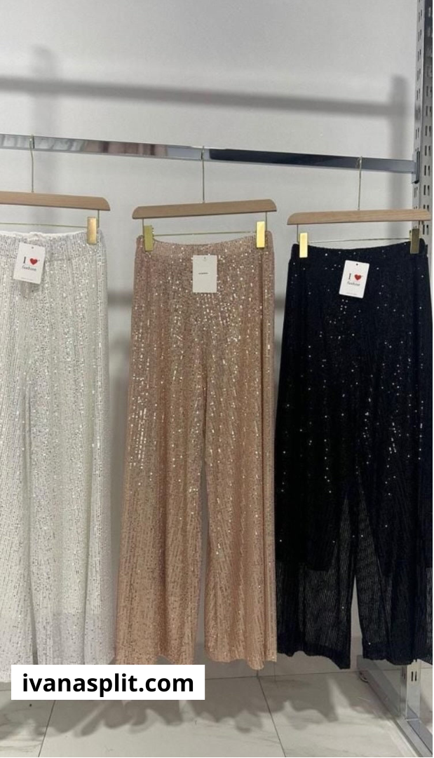 Dodajte dašak glamura svojoj kolekciji odjeće s ovim nevjerojatnim kompletom. Hlače s pajetama su pravi protagonist, sa svojim sjajnim dizajnom i udobnom elastičnom pasicom koja osigurava savršeno pristajanje. Široki kroj hlača daje bezvremensku eleganciju, savršenu za svaku posebnu priliku. U kombinaciji s koordiniranim satenskim bodijem, ova odjevna kombinacija postaje prava modna izjava, spajajući hrabri sjaj hlača s mekoćom i sjajem satena. Nosite je za večernji izlazak, gala događaj ili bilo koju drugu priliku u kojoj želite zablistati i ostaviti snažan dojam. Ovaj izgled zasigurno će privući pažnju i učiniti da se osjećate u središtu pozornosti.