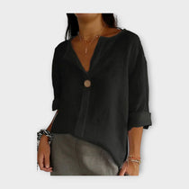 Ova lanena bluza nudi jednostavan stil i udobnost. Karakterizira ju opušten kroj, elegantni V-izrez s gumbom te rukavi koji se mogu podvrnuti za praktičnost i ženstven izgled.