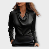 Ova satenska bluza nudi jedinstven sjaj i osjećaj luksuza. S ovratnikom i drapiranim izrezom koji laska, idealan je izbor za ured, poslovne sastanke, ali i posebne izlaske.