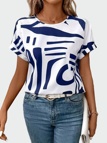Kratka majica u bijeloj boji s plavim apstraktnim geometrijskim uzorcima pruža moderan i svjež stil. Njezin opušten kroj čini je idealnom za svakodnevno nošenje, a može se kombinirati i s trapericama i sa suknjama za elegantnije kombinacije.