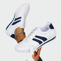 Muške bijele sportske tenisice s plavim detaljima nude bezvremenski stil i svakodnevnu udobnost. Kombinacija bijele boje s plavim prugama stvara minimalistički, ali elegantan izgled, idealan za sve prilike. Gumeni potplat osigurava stabilnost i izdržljivost, dok lagani materijal tenisica omogućuje dugotrajno nošenje.