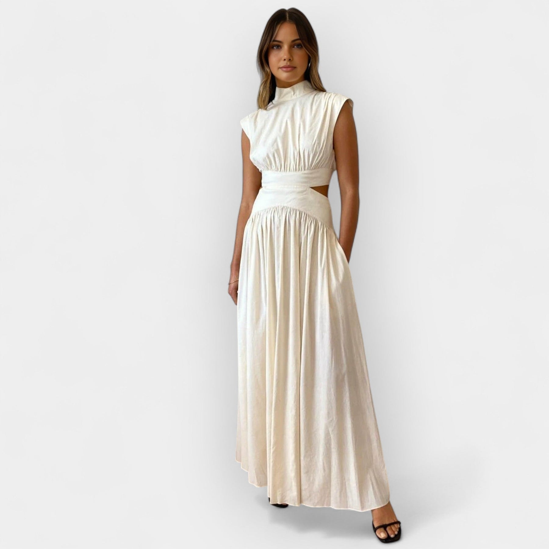 Otkrijte impresivnu haljinu koja kombinira zatvoreni izrez oko vrata s modernim otvorima, nudeći suvremenu i ženstvenu siluetu. Idealna za posebne večernje izlaske s diskretnom dozom odvažnosti.