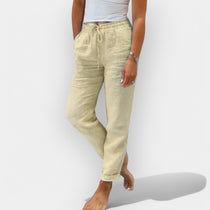 Ove hlače kombiniraju prirodnu eleganciju s ležernim stilom, zahvaljujući laganoj lanenoj tkanini i udobnom kroju. Idealne za tople dane i nenametljive, moderne outfite.