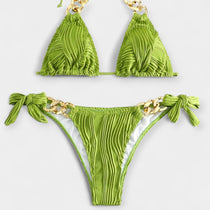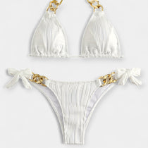 Moderno i zavodljivo, ovaj dvodijelni bikini impresionira reljefnom prugastom tkaninom i zlatnim detaljima u obliku prstena i lanca. Halter izrez i trokutasti gornji dio naglašavaju poprsje, dok mašna sa strane daje zaigran karakter – idealno za bazen ili plažu sa stilom.