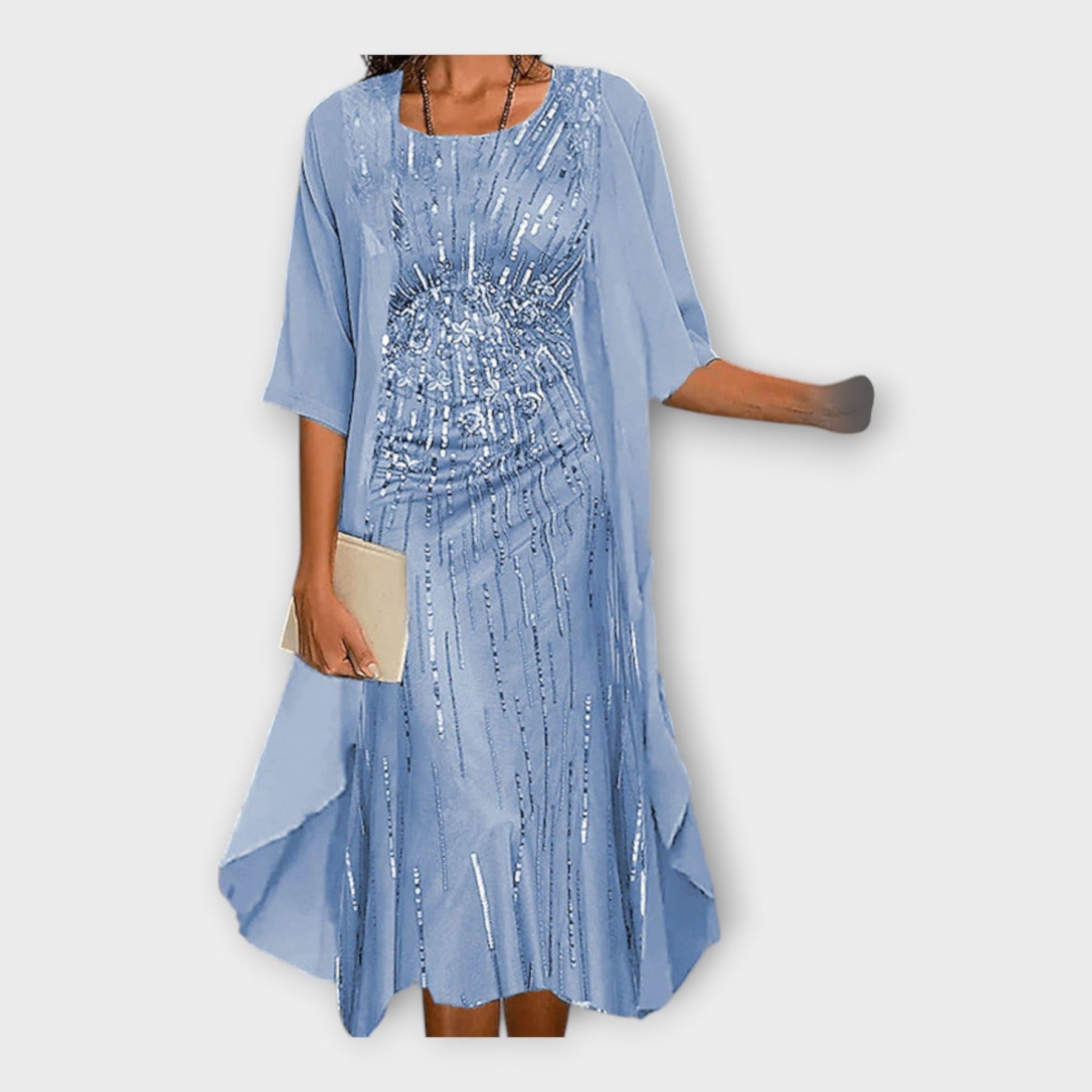 Ova prekrasna haljina s odgovarajućim kardiganom spaja stil i udobnost, idealna za svaku priliku.