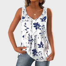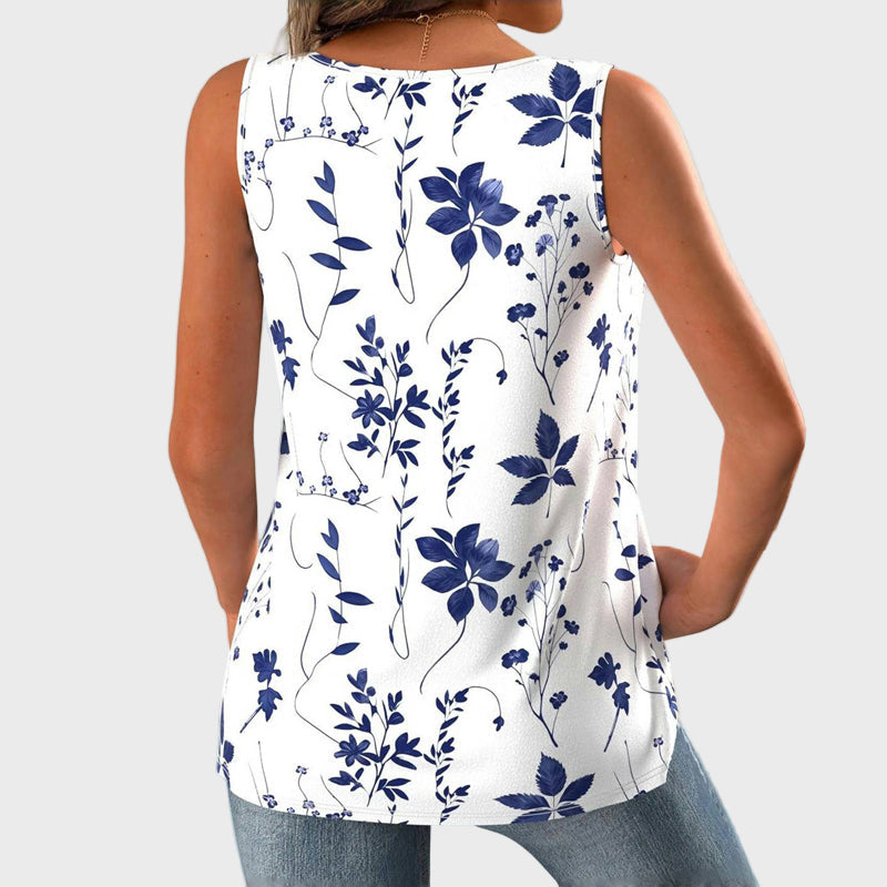 Uživajte u svježini ljeta s ovim bezrukavnim topom na bijeloj podlozi, ukrašenim plavim cvjetnim uzorcima. Njegov opušteni kroj pruža udobnost i slobodu pokreta, dok V-izrez dodaje ženstvenost i eleganciju. Idealno je za svakodnevne i ljetne kombinacije.