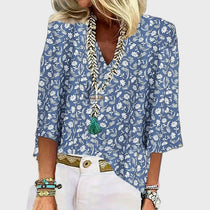Osvježite svoju svakodnevnu odjeću ovom plavom bluzom ukrašenom sitnim bijelim cvjetnim uzorcima. Klasičan dizajn s rukavima tri četvrtine pruža udobnost i eleganciju, dok opušteni kroj čini ovu bluzu idealnim izborom za sve dijelove dana.