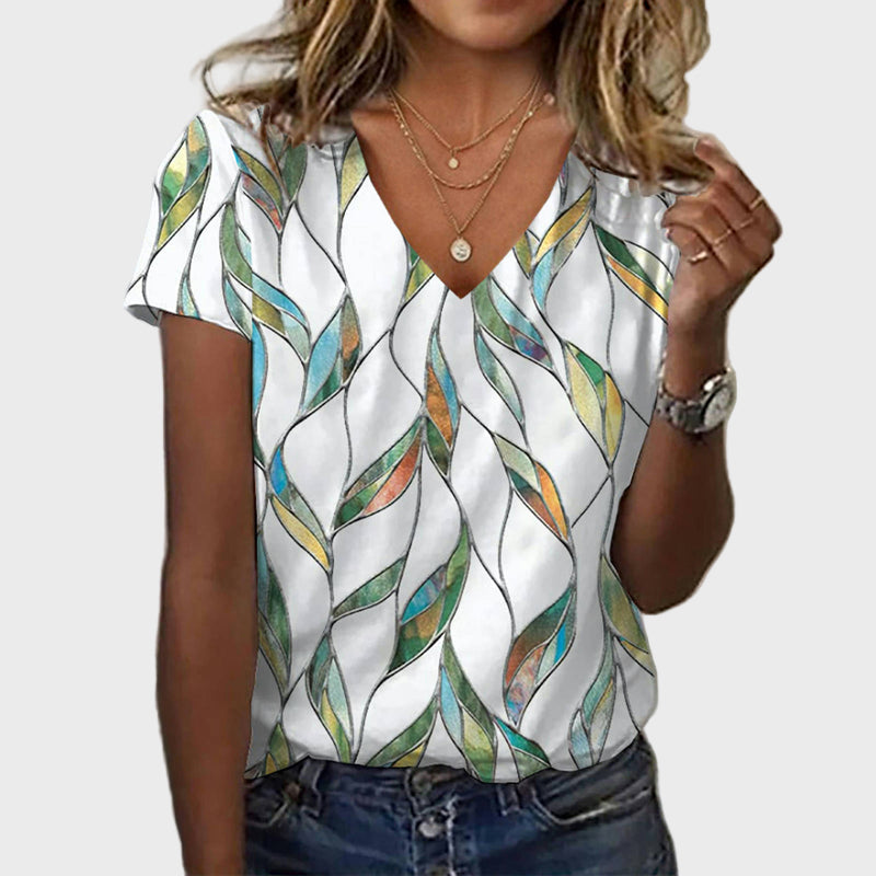 Izdignite svoju modernu stranu stila s ovom bluzom na bijeloj podlozi, ukrašenom šarenim valovitim uzorcima u nijansama zelene, plave i zlatne. V-izrez daje ženstvenost, dok opušteni kroj pruža udobnost i eleganciju za svaku priliku.