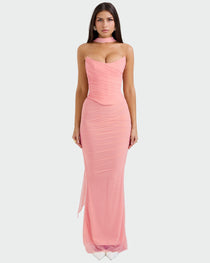 Naborani detalj na prsima i vezanje poput korzeta u struku daju ženstvenost i luksuz, dok maksi dužina pruža bezvremensku profinjenost.