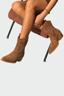 Čizmice nadahnute western stilom koje se ističu zahvaljujući posebnim vezovima i njihovoj snažnoj prisutnosti. Dizajn im kombinira udobnost i stil, čineći ih idealnim odabirom za svakodnevne, ali i posebne prilike. Stabilna potpetica pruža udobnu potporu, dok detalji na gornjem dijelu daju autentičan country štih.