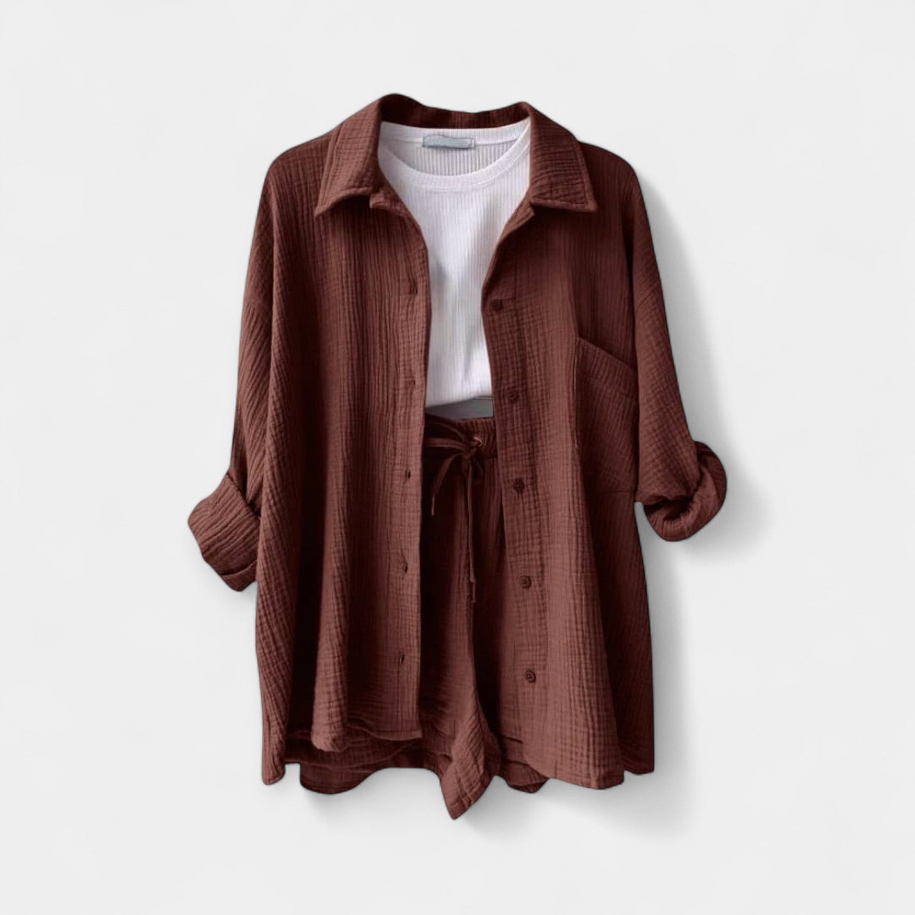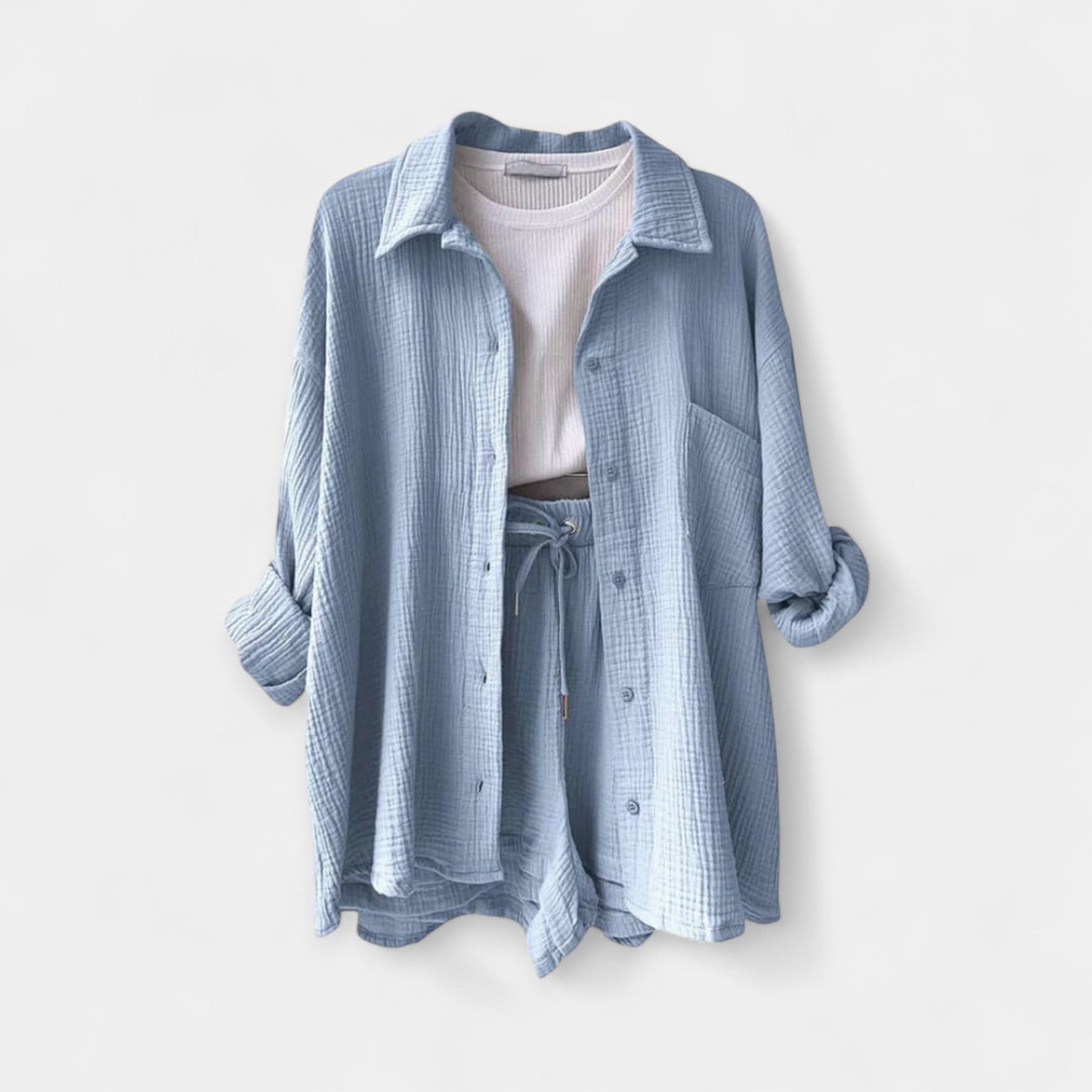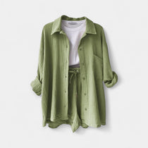 Lagani i elegantni set za najtoplije dane u godini. Idealan za trenutke uz bazen, šetnje ili ljetne izlete sa stilom i udobnošću.