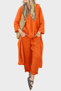 Ovaj elegantni laneni komplet u tamnoplavoj boji spaja nenametljivu profinjenost i svakodnevnu praktičnost. Idealan za ljetne izlaske, pruža slobodu kretanja i laganu eleganciju.