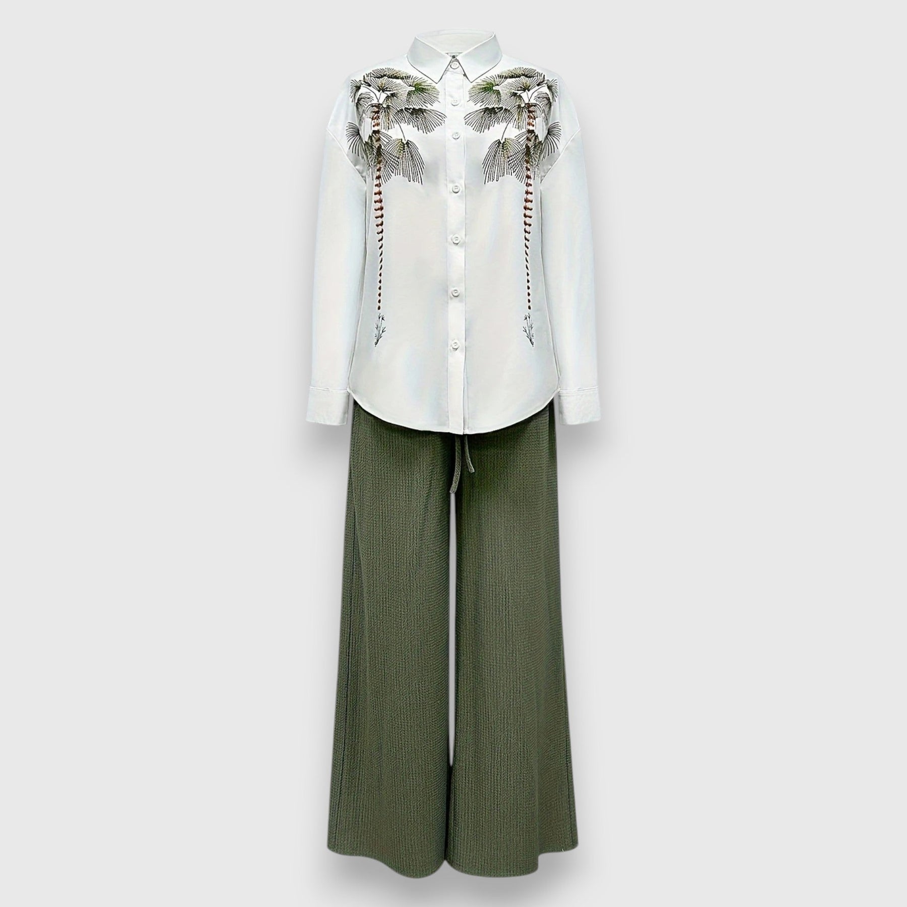 Set Nirvana kombinira elegantnu bluzu s nježnim cvjetnim uzorkom i tekuće hlače širokih nogavica – savršeno za moderne dane. Lagana tkanina i visoki ovratnik daju kombinaciji ženstvenu i profinjenu notu.