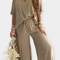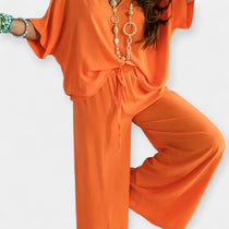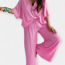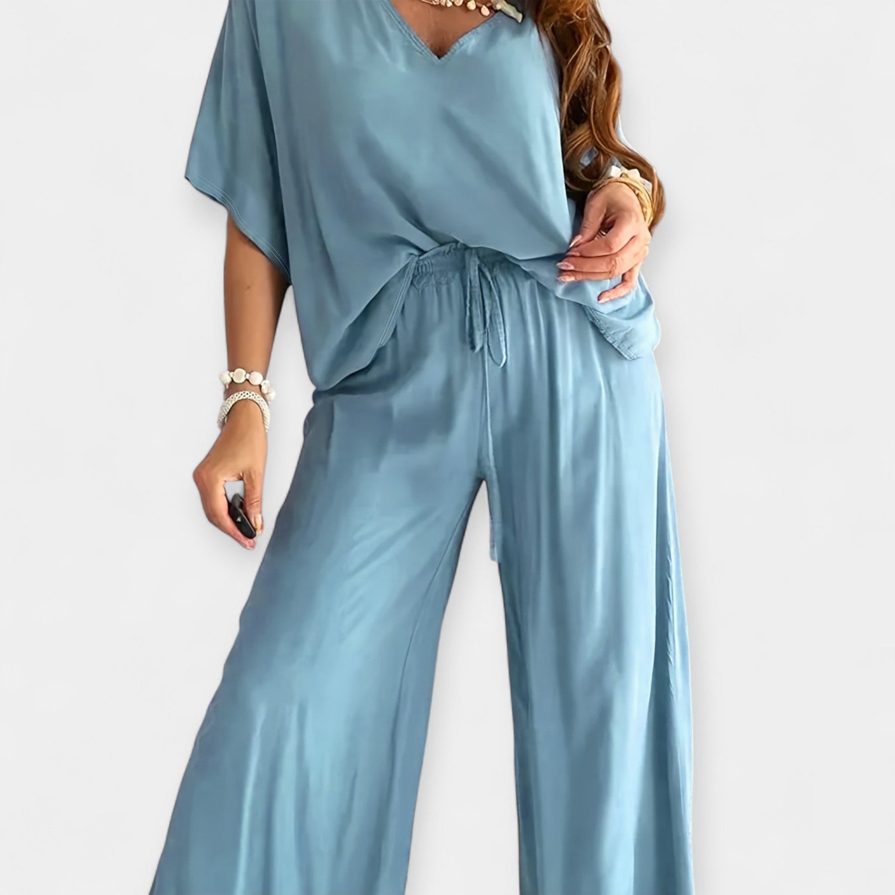 Ovaj set utjelovljuje opuštenu eleganciju. Široke hlače s udobnim nogavicama skladno se kombiniraju s ležernom bluzom koja ima V-izrez i široke rukave – za stil koji diše i laska svakoj silueti.
