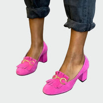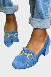 Cipele s potpeticom s posebnim karakterom i elegantnim detaljima koji se ističu. Metalni ukras na gornjem dijelu dodaje dašak luksuza, dok dekorativni resasti elementi daju retro, ali i moderan izgled. Srednje visoka potpetica osigurava udobnost i stabilnost, što ih čini idealnim izborom za svakodnevne kao i za elegantnije kombinacije.