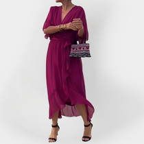 Ova prozračna haljina kombinira eleganciju i ležeran stil, nudeći udobnost i profinjenost pri svakoj vašoj pojavi.